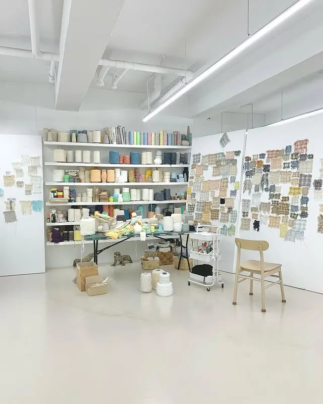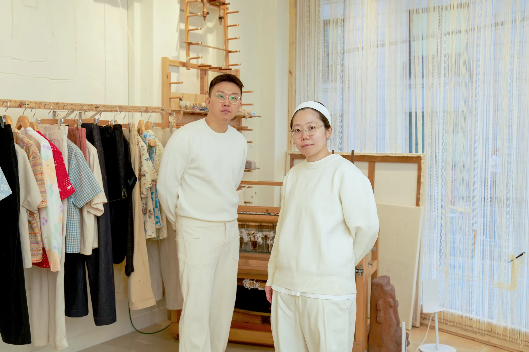 Elements of their custom-built loom have been reimagined as clothing racks, and hand-woven yarn frames adorn the shop windows—offering visitors a tangible glimpse into their creative process.