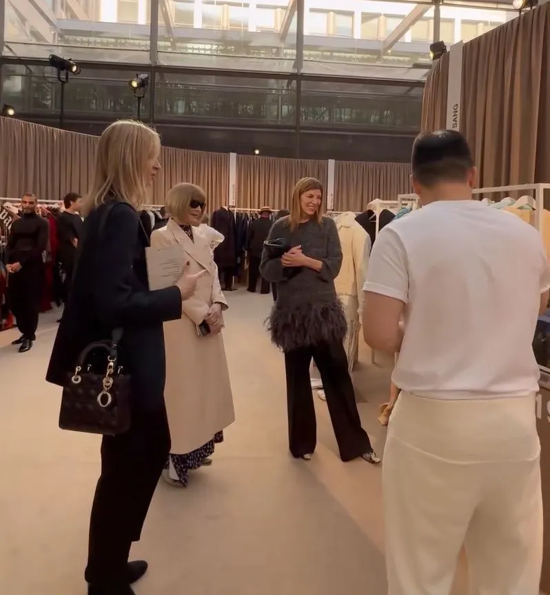 Hong Young-shin, founder of young n sang (far right) and a semifinalist for the 2025 LVMH Prize, is seen explaining the collection to Anna Wintour, Editor-in-Chief of Vogue (second from left). (Source: young n sang)
