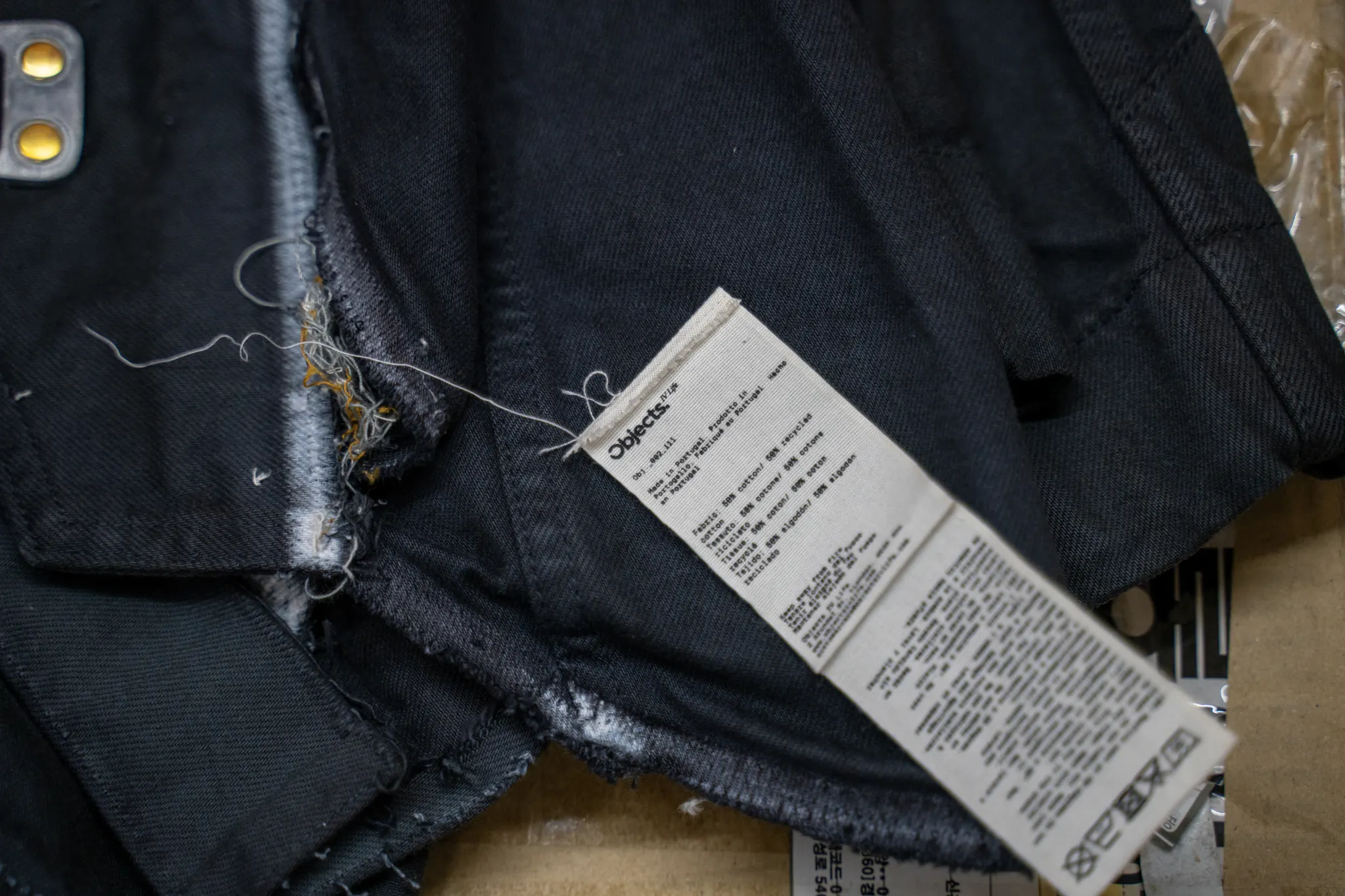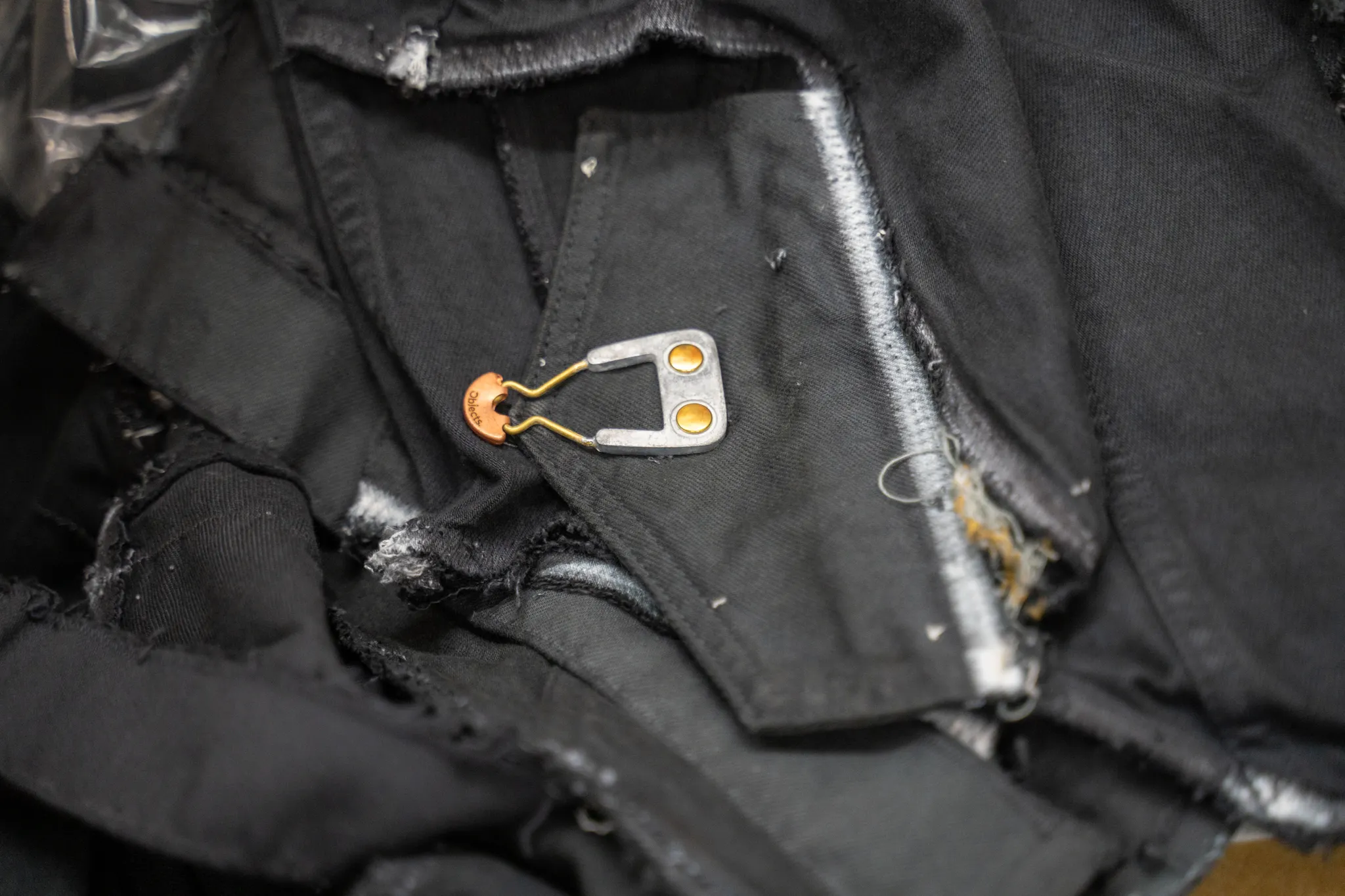 I think the biggest thing with Objects IV Life in trying to use sustainable processes is that it’s very difficult to replicate things that are usually novel or not used. When we talked to the factory about using these buttons that were unsealed, they couldn’t understand why we would want to have a product like that. That stain you’re seeing next to the button is intentional. It’s something that goes against what we imagine fashion would be. So there’s a lot of education and conveying to our producers that this is the way we actually want it to be.