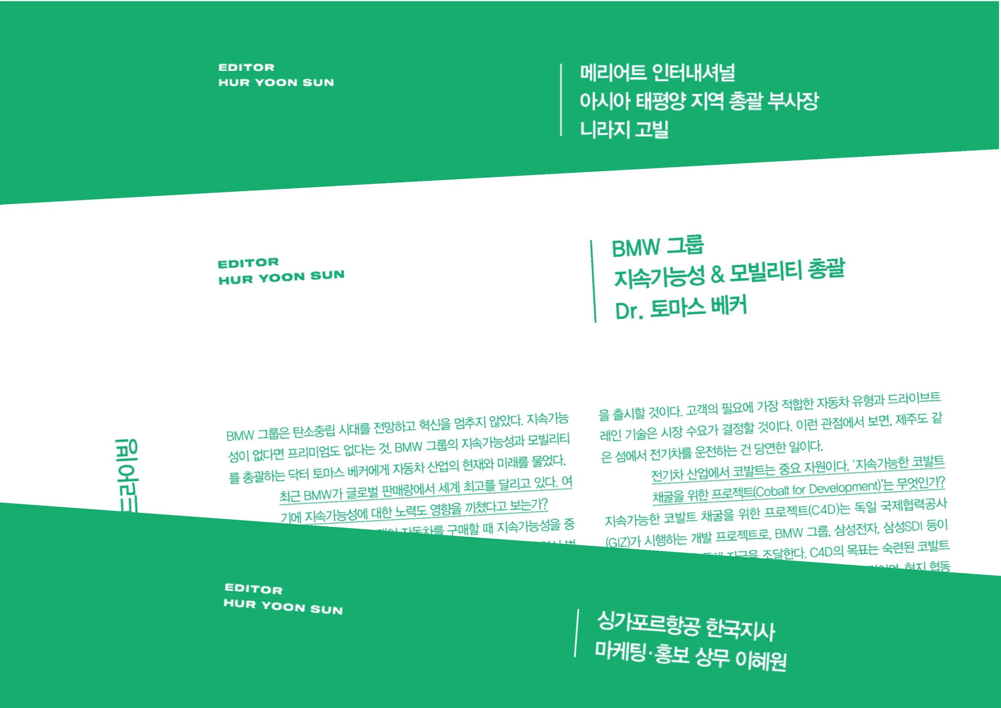 A 현실적인 매체라는 점이요. 우리 일상과 가까이 있는 것을 취재하는 걸 중요하게 생각해요. 그러다 보니 패션 잡지가 잘 이야기하지 않는 인물이나 산업도 적극적으로 다루어 왔어요. 이를테면 비엠더블유, 싱가포르 항공, 메리어트 인터내셔널과 같은 기업의 지속 가능성 정책과 관련하여 인터뷰하기도 했는데요. 필연적으로 탄소를 발생하는 산업은 이를 어떻게 해결하는가를 들어보려고 했습니다. 패션지에서 다룰 내용인가 싶으실 수 있지만 이들 산업은 우리 일상과 아주 밀접하게 닿아있기에, 이야기를 들어보고 싶었어요. 일상을 반영하면서도 패션 매체가 잘 조명하지 않는 이야기까지 전하기 위해 늘 고민합니다. 그래서인지 ‘그린 이슈’가 발간되는 4월호는 항상 구해서 본다는 브랜드도 있어요.